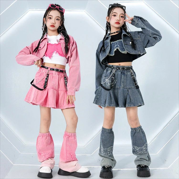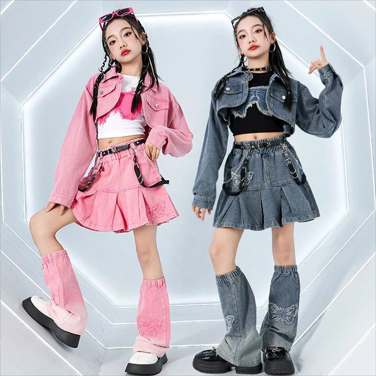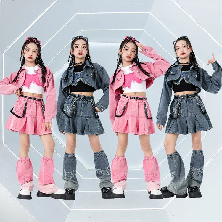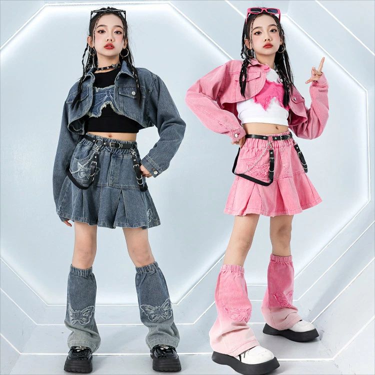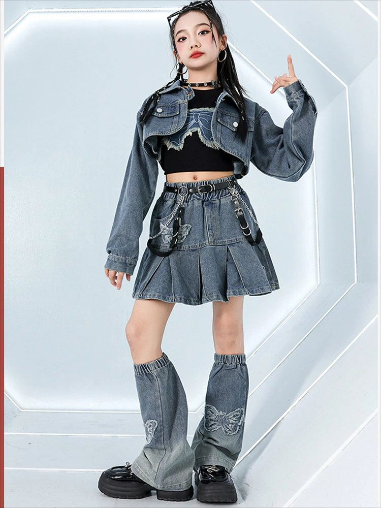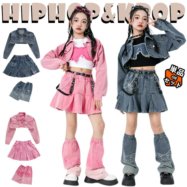 デニム ピンク キッズ ダンス衣装 セ キッズ トップス シャツ ブラウス 早い者勝ち ブルー ピンク ショート丈ジャケットのみ スカート+レッグウォーマー 3点セット 4点セット