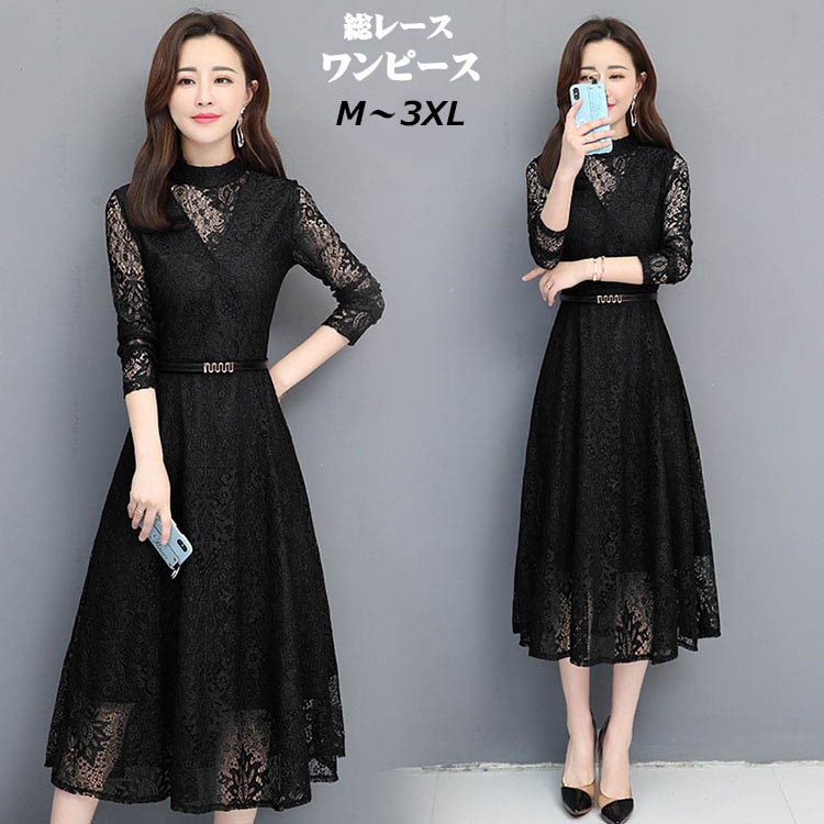 総レース ワンピース 結婚式 ドレス レディースファッション 超目玉商品 ブラック ワインレッド M L XL 2XL 3XL