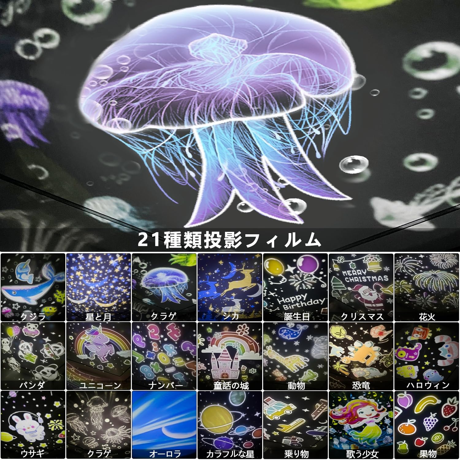 【21種類映画フィルム】クジラ、クラゲ、星と月、ユニコーン、歌う少女、シカ、恐竜、オーロラ、誕生日、カラフルな星、果物、乗り物、動物、クリスマス、童話の城、花火、パンダ、ナンバー、モンスター、クラゲ、ウサギ21種類映画フィルムを付いて、ロマンチックな雰囲気を作り出し、子供の好奇心と想像力を刺激し、楽しい時間を過ごすことができます。毎日フィルムを交換すると、部屋全体が夢のような世界に変わり。映画フィルムは可愛くて、季節の装飾に限らず、男の子も女の子も楽しめる絵柄があり、幅広い用途に対応しています。子供だけでなく、大人の心を癒すインテリア雑貨としても適しています。
