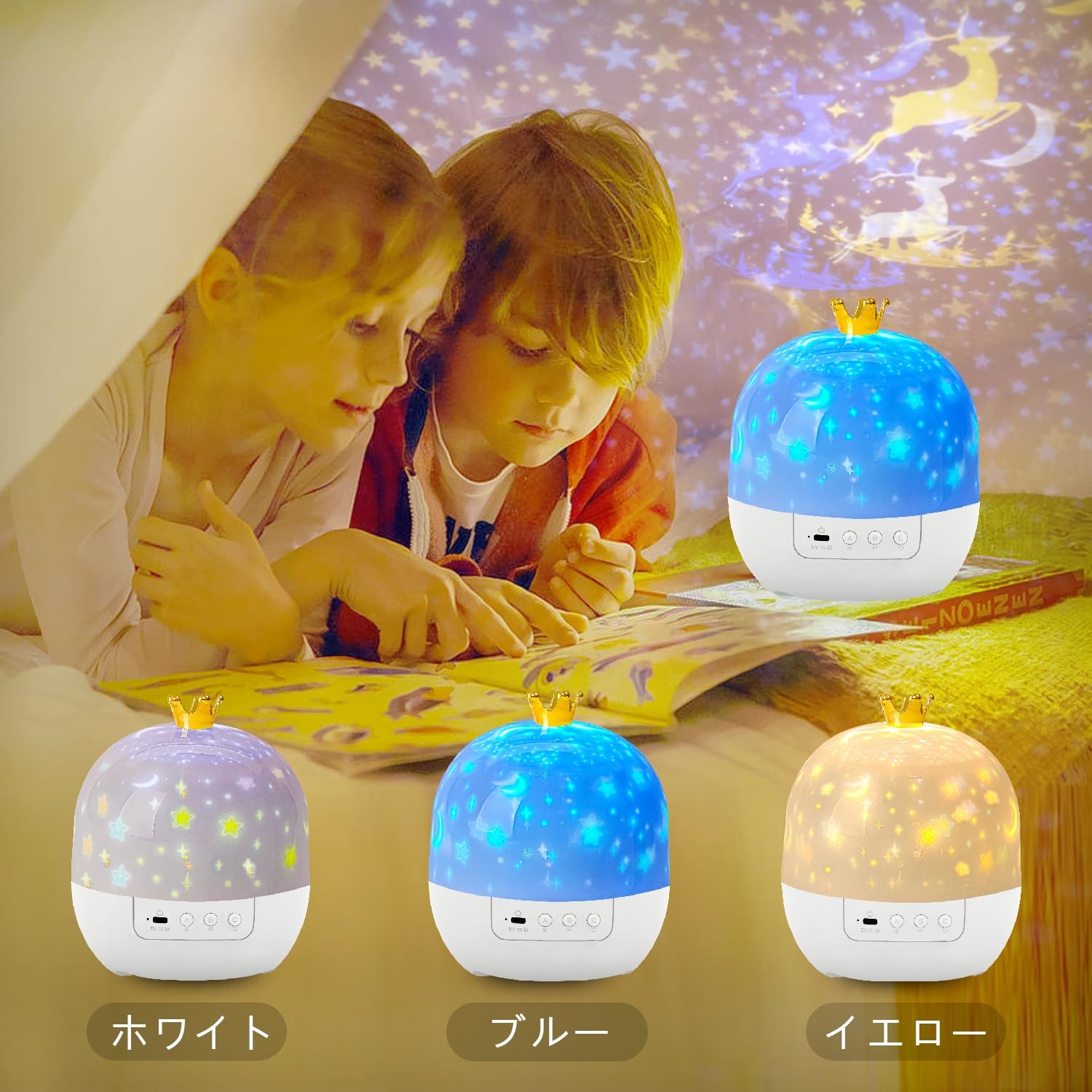 【プラネタリウム家庭用とナイトライト】クラウンような可愛らしい形状を採用,大人も子供も大人気です。子供向けのデザイン、素敵なパッケージが付属しています。高品質な素材で丁寧に設計されており、映画のシーンはすべて星空や海と組み合わされ、夢のような美しい雰囲気を作り出しています。プラネタリウムとして使う時、ライトのカバーを外してお使いください。カバーをとれば天井と壁に可愛くて素敵な絵が映ります。綺麗で星空が広範囲で見ててプラネタリウムに来てるような感じですよ!カバーをつけたままだとナイトライト、ベッドサイドランプです。ナイトライトと投影ライトはお好みに応じて自由に切り替え可能。