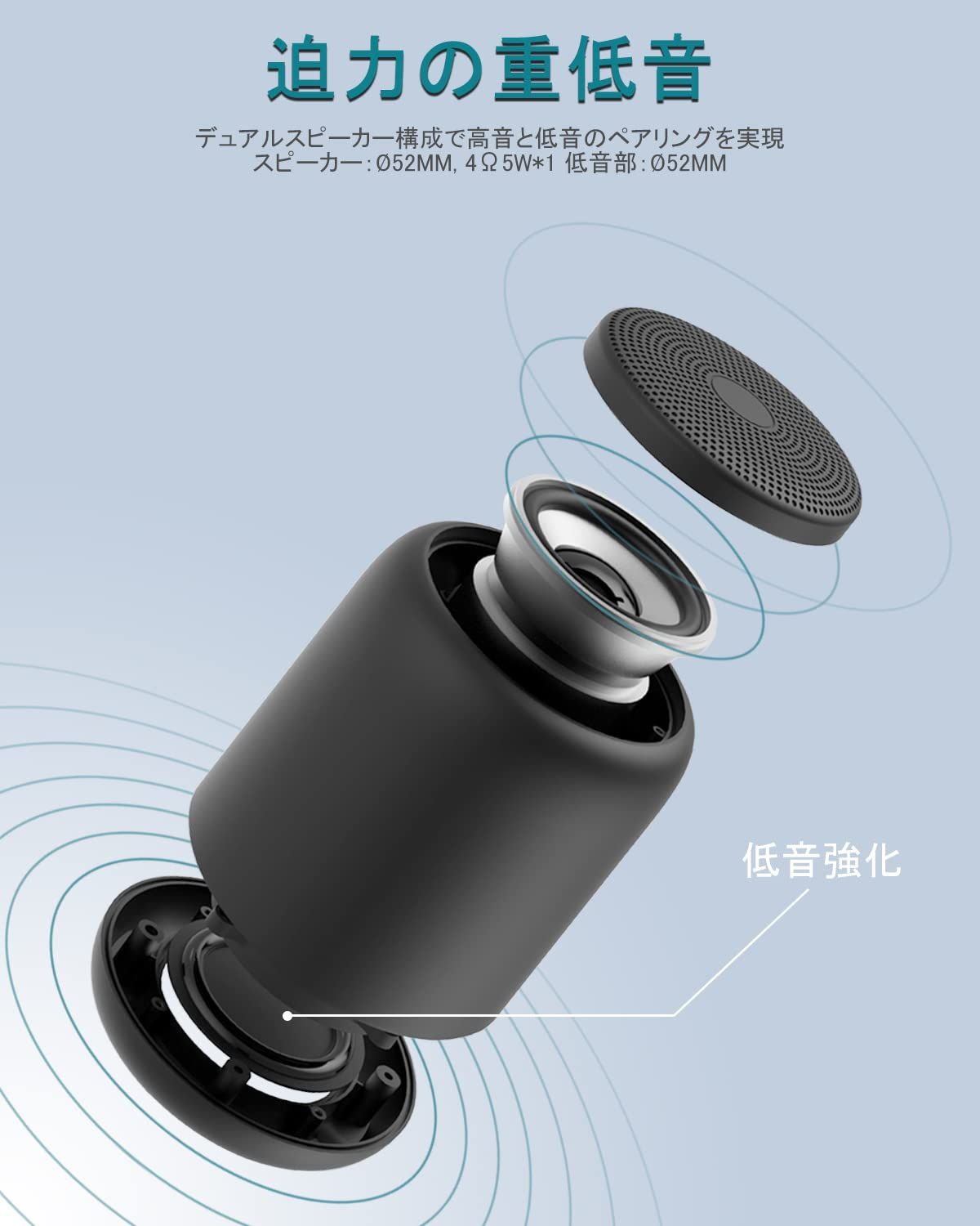 【低音強化&迫力がある大音量】音の低音が効果的です。5Wのデュアルドライバーと2つの高性能サブウーファーを搭載し、誰もが想像する以上にパワフルで没入感があります。クリアな高音、中音域、特に強化された低音を任意の音量で再生でき,映画のような360°ステレオサウンドを楽しむことができます。