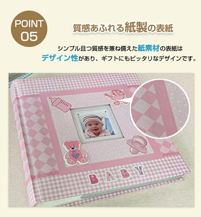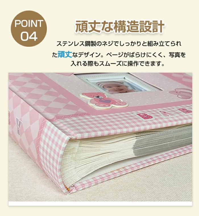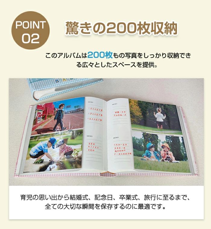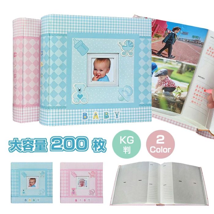 KG判写真が最大200枚入る大容量。どんどん増える子供の写真をしっかり整理でき、これ一冊で成長を長く記録できます。