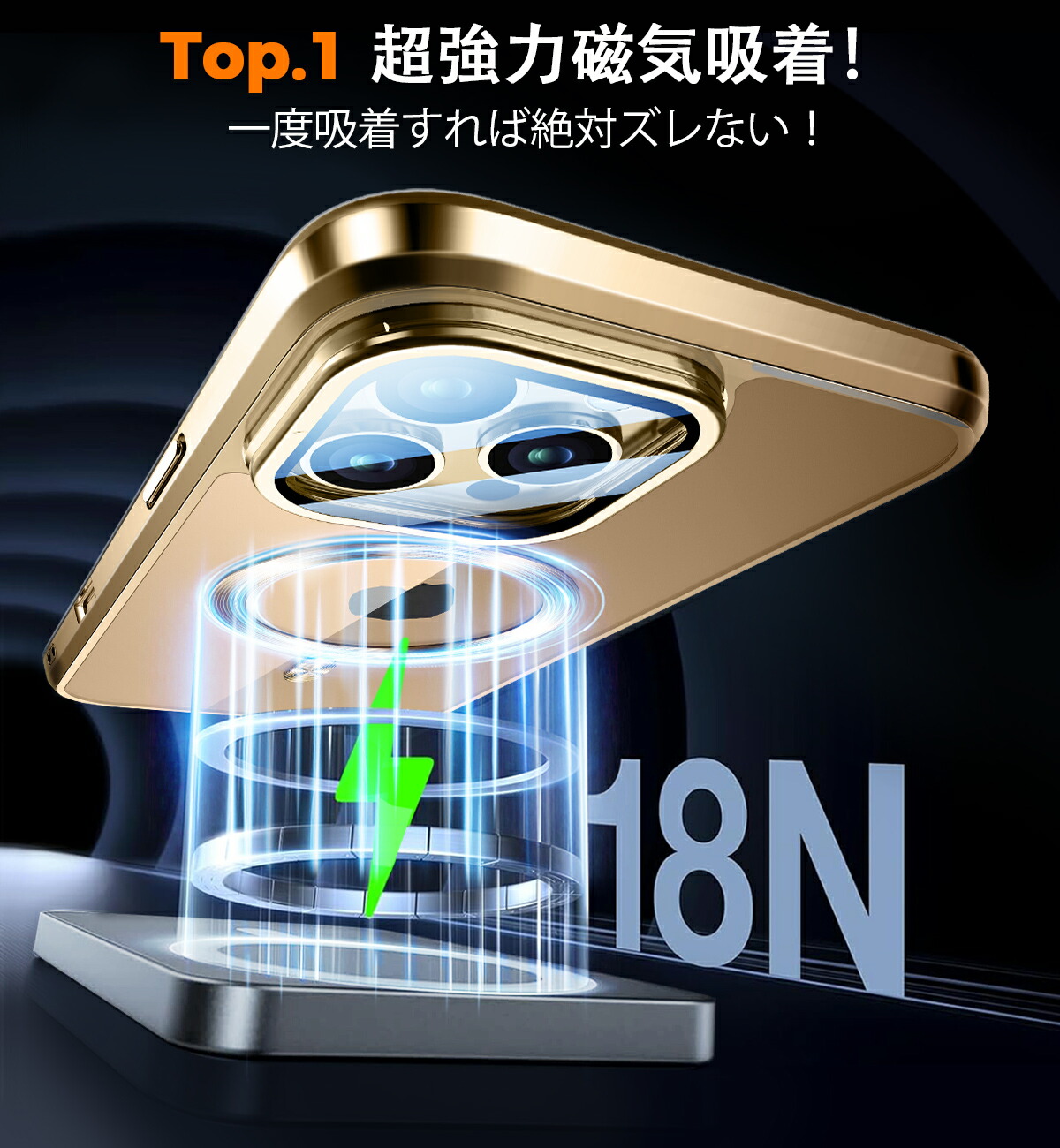 マグネットリングはアルミニウム合金製です。このケースのマグネットは複数回の性能アップグレードを経て、iPhone 本体に設計されたマグネットアレイと充電コイルに完全に位置合わせできます。急速充電に対応し、ワイヤレス充電器やカーマウントに安定して接続。回転や揺れがあっても脱落しません。ドライブ中に激しい振動が加わった場合でも、マグネットカーマウントから脱落することはありません。