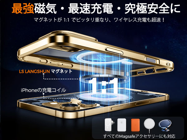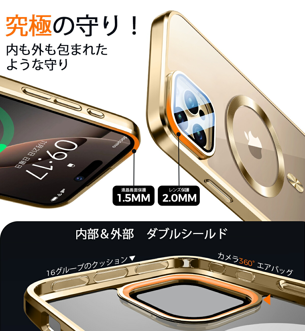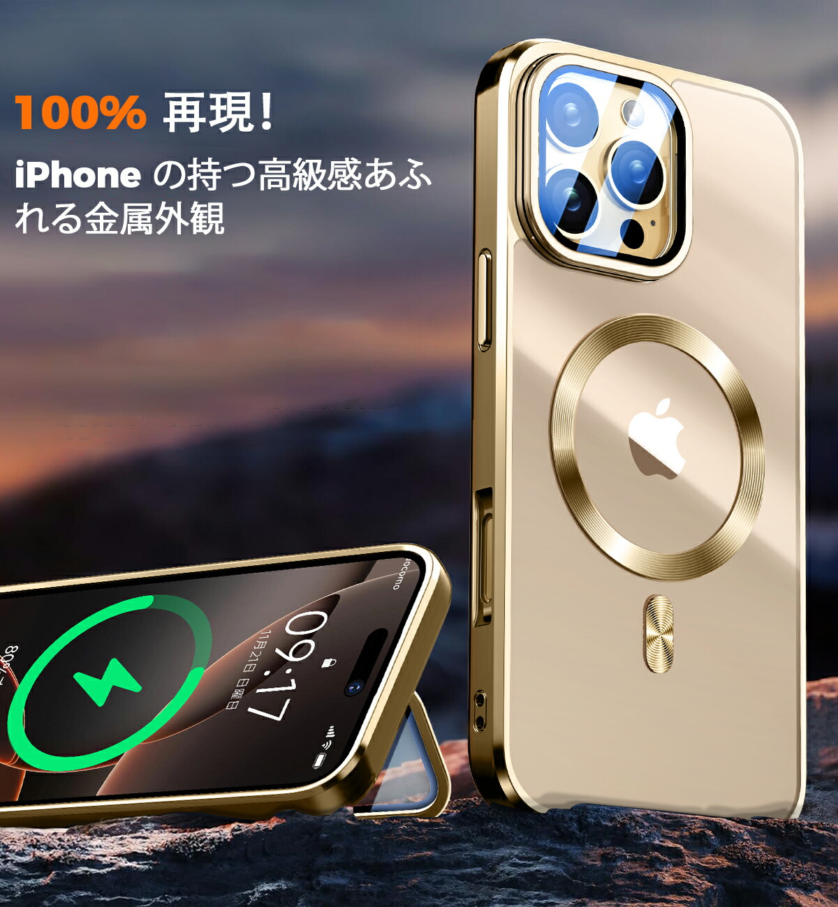 マグネットケースの側面はドイツ・バイエル製 TPU 素材を使用し、メッキ処理と研磨加工を施すことで、iPhone 本体のステンレス外観を 100% 再現しています。クリアタイプのケース背面には最新のナノバリア酸化防止技術を搭載し、表面にポリマーバリアを形成することで、紫外線(UV)や皮脂から iPhone を全面的に保護します。100% の透明度と黄変防止技術を両立させています。