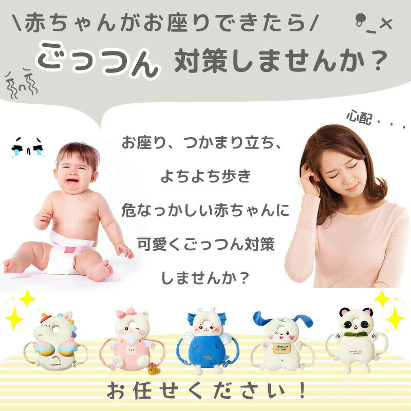 お座りや、つかまりだち、よちよち歩きを始めたお子様が転倒した時、頭や背中を打ち付けるのを緩和します。肩ひもが自由に調整できるので、赤ちゃんの成長に合わせて長くご使用いただけます。
