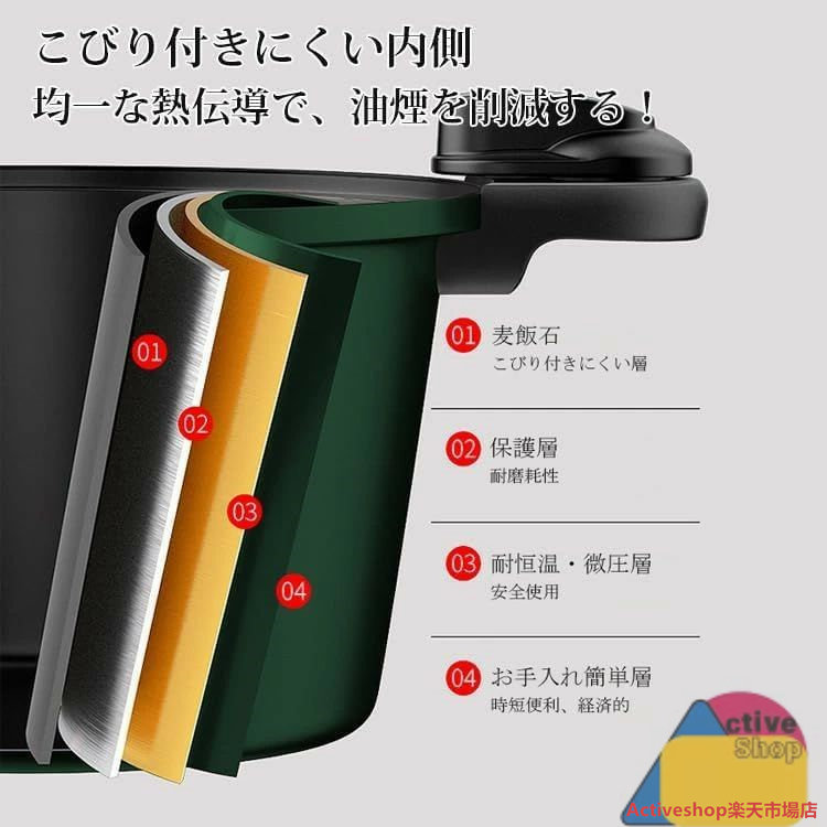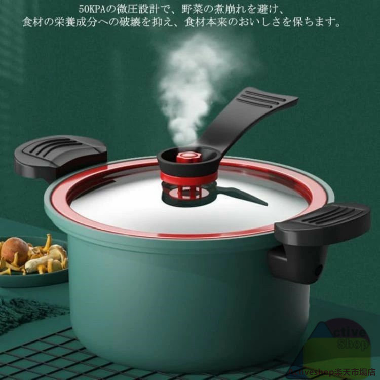 A: マイクロ圧力鍋は、水が沸騰するとすぐに弱火に変わります。 弱火でじっくりと煮込むので、食材を素早く調理できます。 弱火から中火、中火から強火に変化する蓄熱設計の煮込みマイクロプレッシャークッカーです。(火を強火にしないでください。エネルギーによって圧力が高くなりすぎて、鍋があふれたり、ガスなどが発生したりします。)
