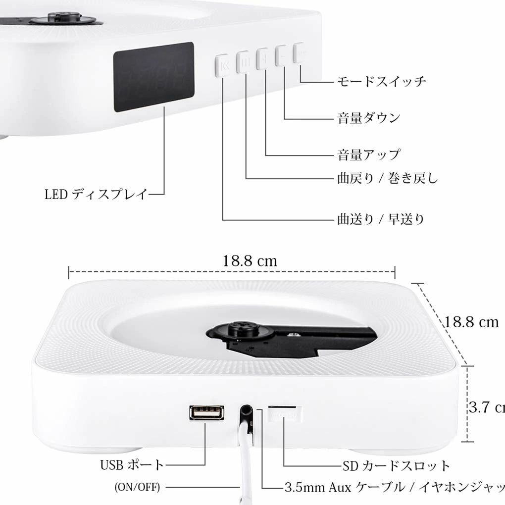 壁掛け式CDプレーヤーには、LEDディスプレイが付きました。すべての機能がLEDディスプレイに表示されるので分かりやすくて大変便利です。例えば、CDモードは“CD”、Blueモードは"blue”、Micro SDモードは“SD”アイコンが表示されます。高級感が溢れるオシャレで人目を引くデザインはインテリアとしても最適です。ご注文:該当の壁掛けcdプレーヤーは透明蓋が付いておりません。ご了承ください。