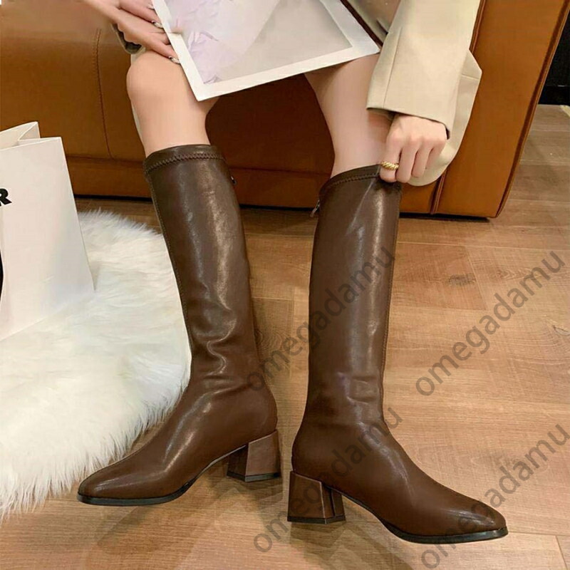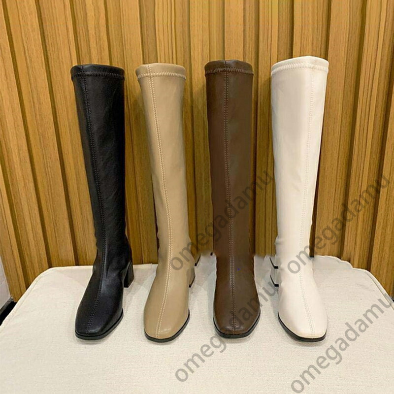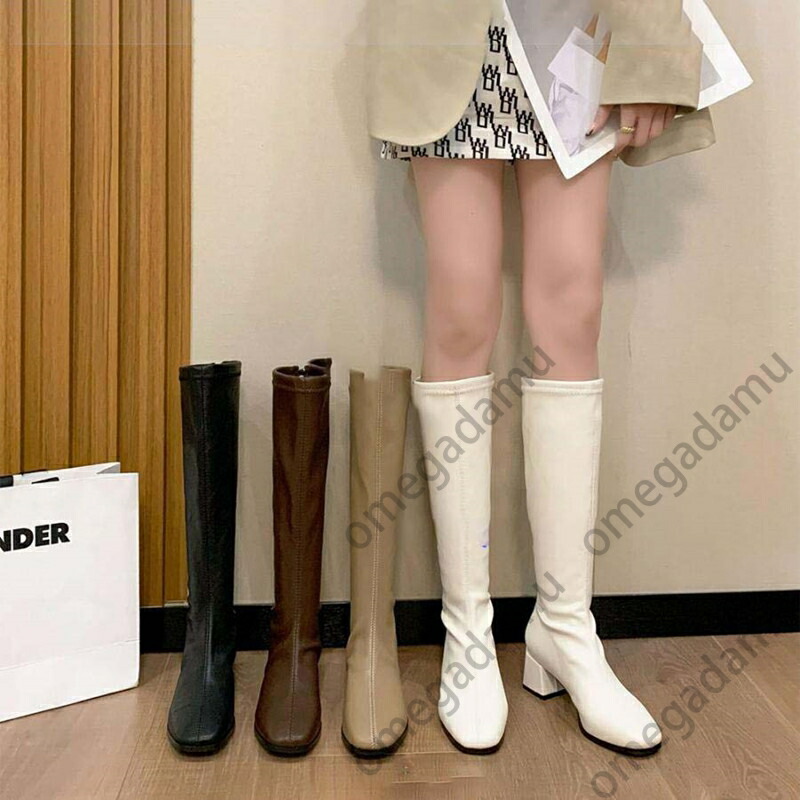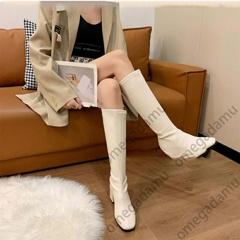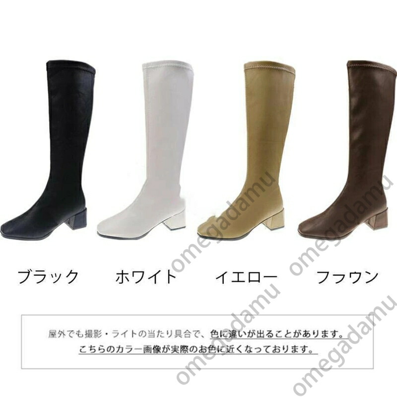 ロングブーツ レディース スクエアトゥ ロング丈 太めヒール ストレッチ 白ブーツ おしゃれ きれいめ PU 美脚 履きやすい 歩きやすい 黒 大人 秋冬 全4色 白