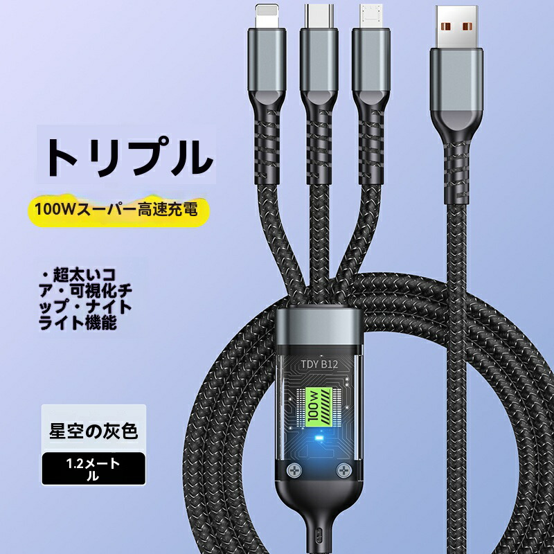 100W透明ライト三合一デジタル表示対応6A超高速充電ケーブル(Huawei/Apple対応)