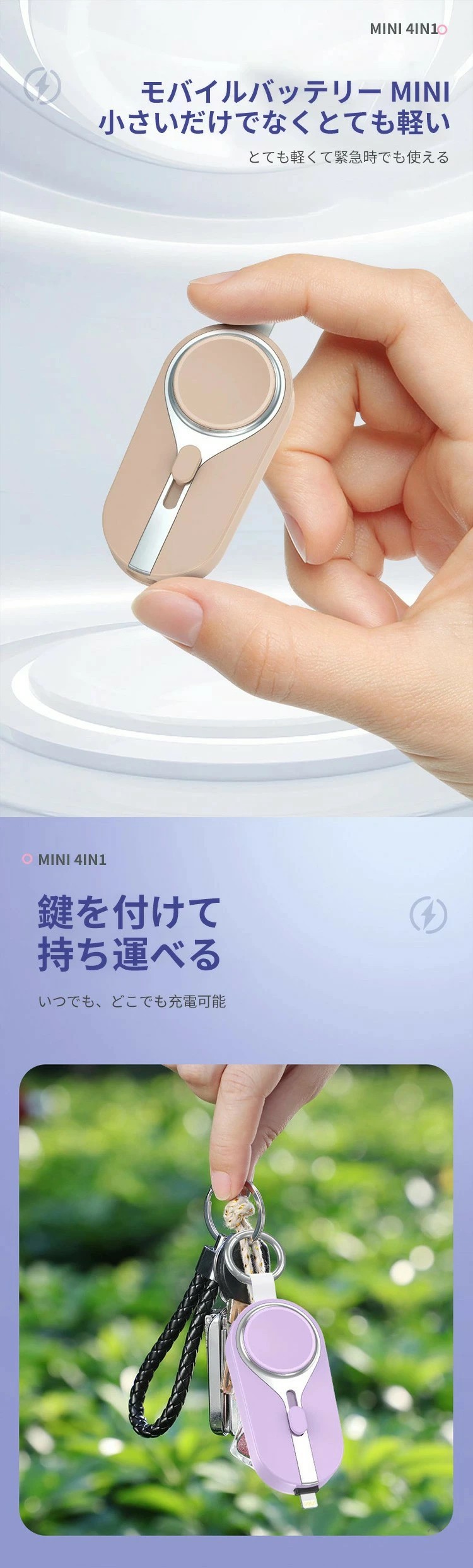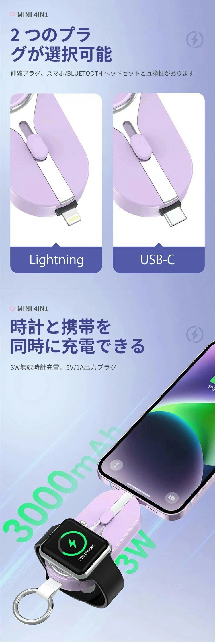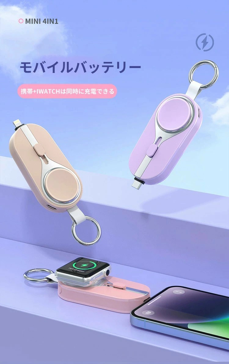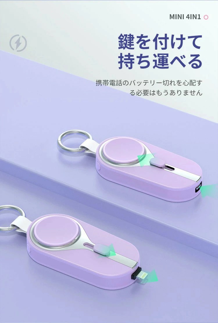 ソーラーモバイルバッテリー ミニ mini キーホルダー式 軽量 便利 小型 直接充電 コネクター内蔵 ケーブル内臓 3000mAh 無線充電 ウォッチ Type-C タイプC ライトニ iPhone