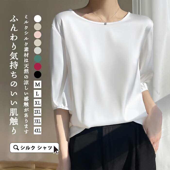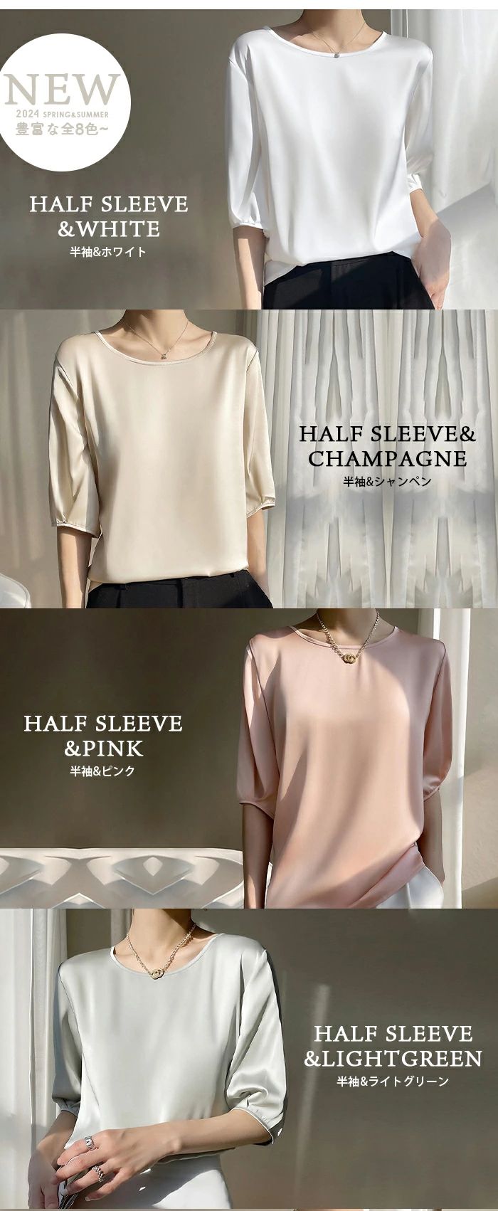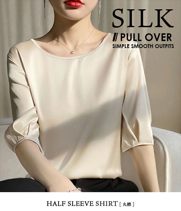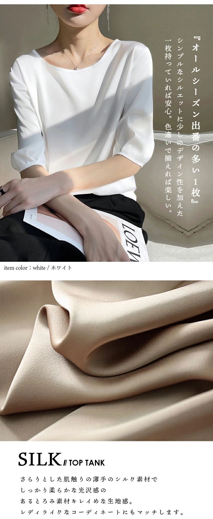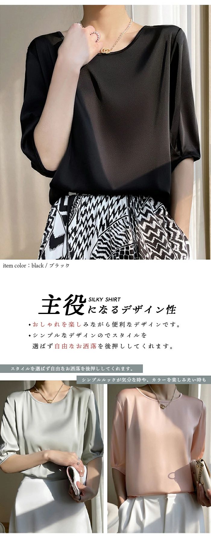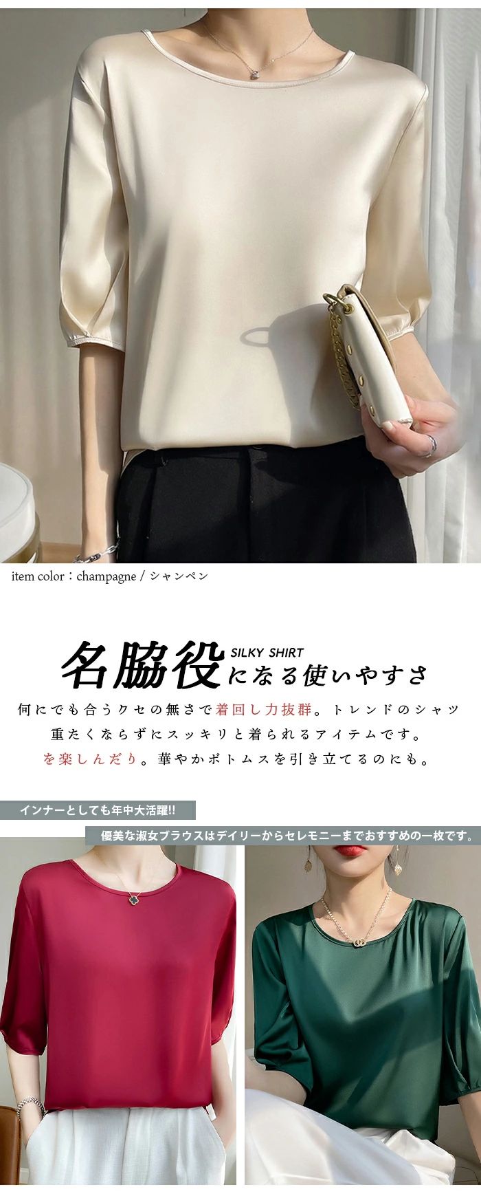 シルク シャツ 五分袖 ブラウス レディース サテン シャツブラウス ショート丈 プルオーバー クールネック Tシャツ シルクサテン トップス 体型カバー インナー 大きいサイズ 吸湿 速乾 敏 薄手