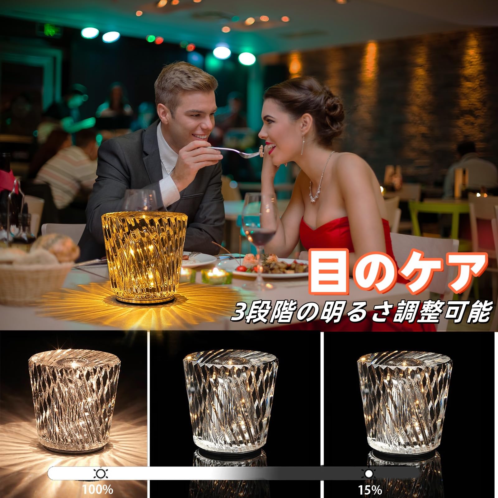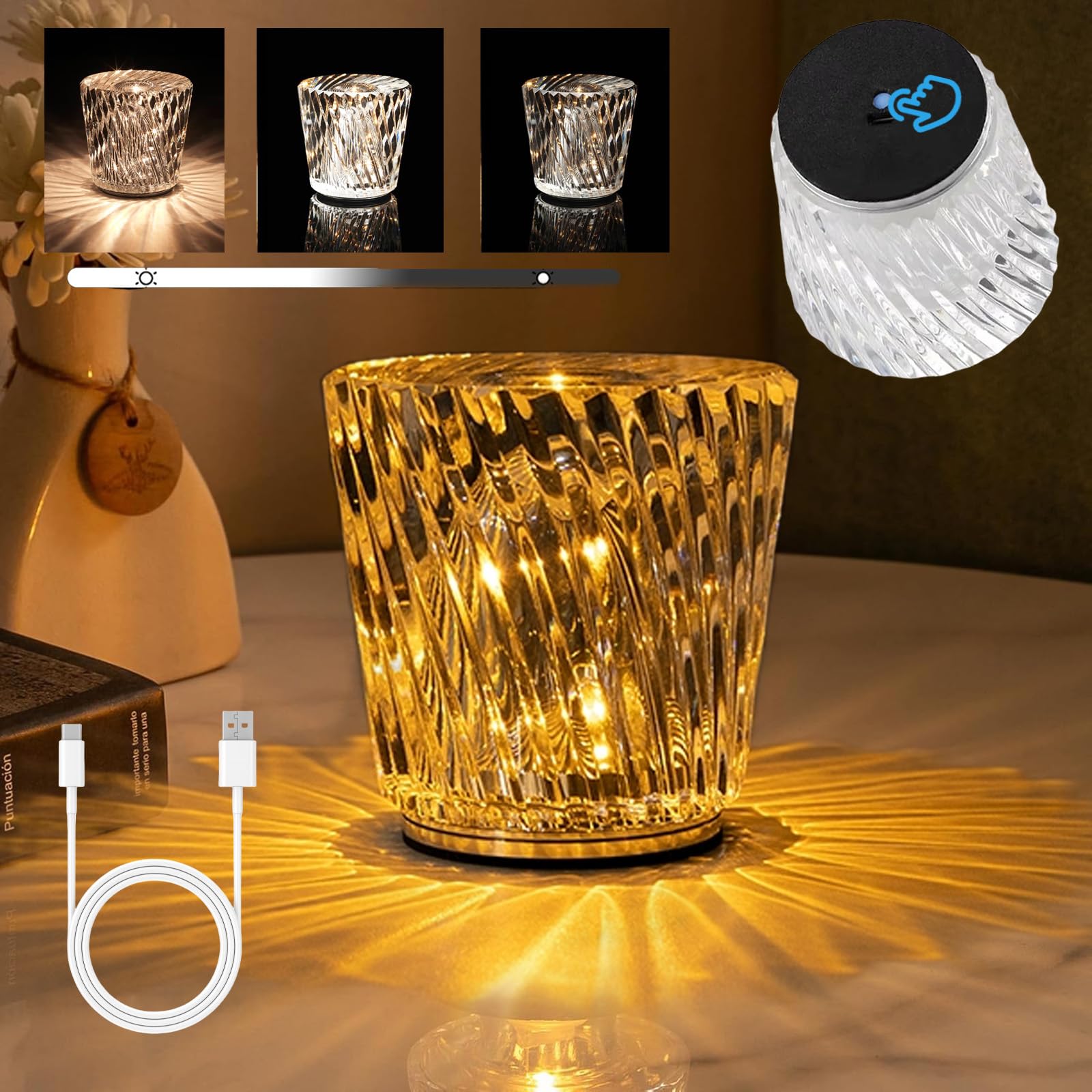 クリスタルテーブルランプ ダイヤモンドテーブルライト ベッドサイドusb充電式の3つの明るい色 ナイトライト 寝室間接照明 卓上ルランプ ルーム ナイトスタンド ランプ コードレス装飾