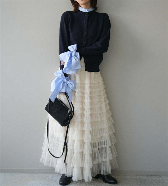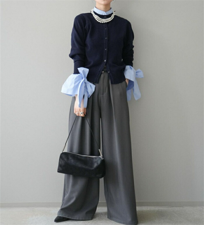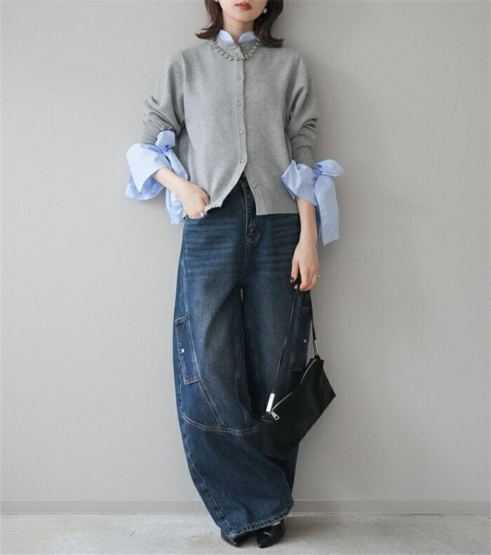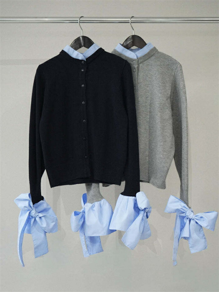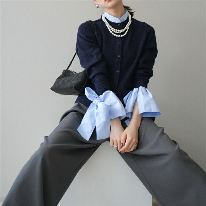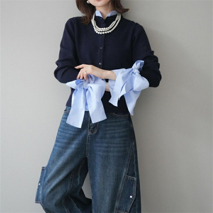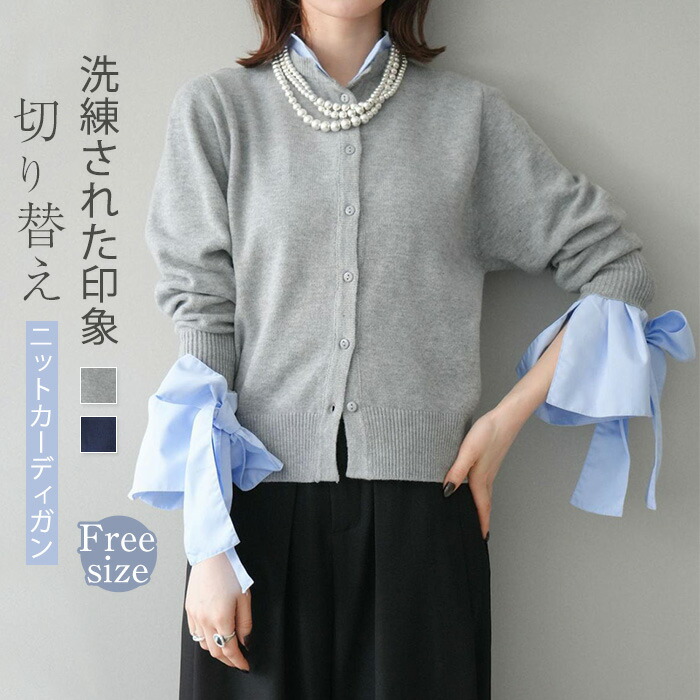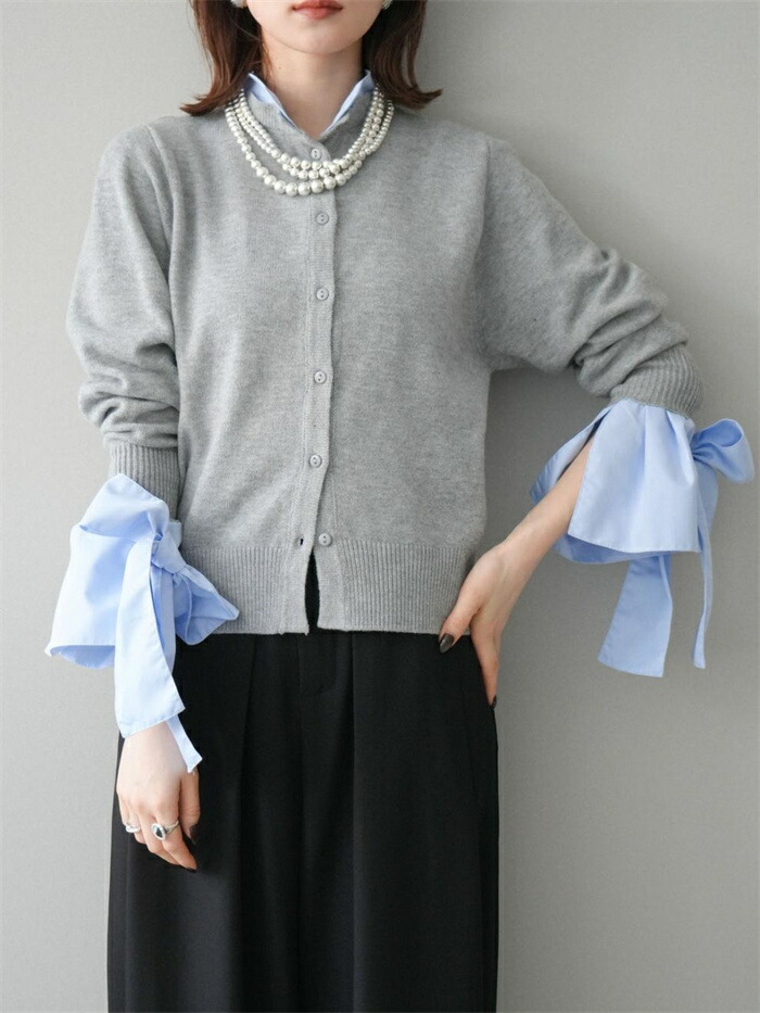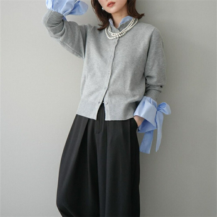 ニットカーディガン 重ね着風 リボン レディースファッション 続々入荷中 ブルー グレー
