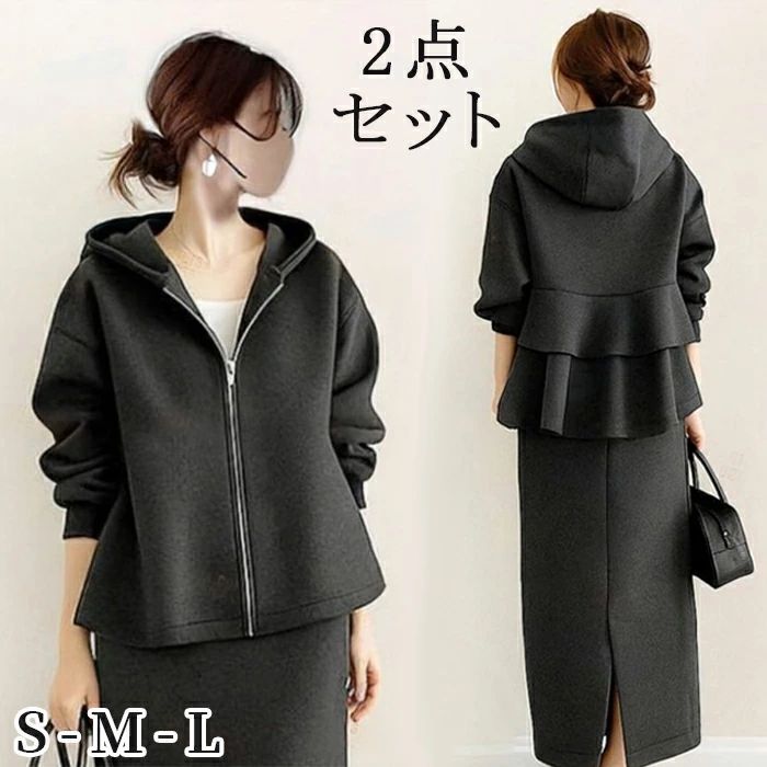 レディース セットアップ コート ロングスカート 2点セット パーカー タイトスカート ジャケット 上下セット トレーナー ジャージ トップス フード付き バックフリル ギャザー 長袖 ジップ マキシ