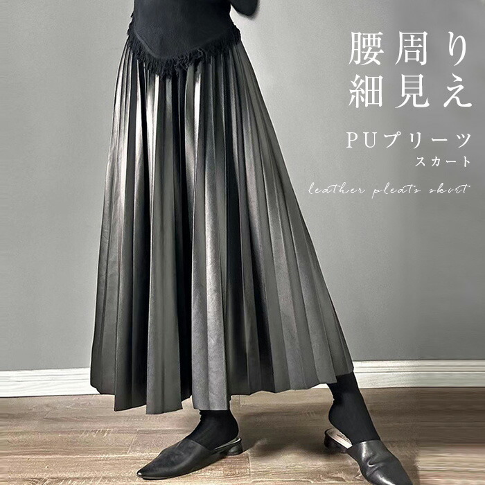 レザースカート レディース スカート プリーツ フェイクレザー 春 秋 冬 ボトムス トレンド サテン風 おしゃれ マキシ丈 エレガント ウエストゴム お洒落 ゆったり 体型カバー きれ 美シルエット