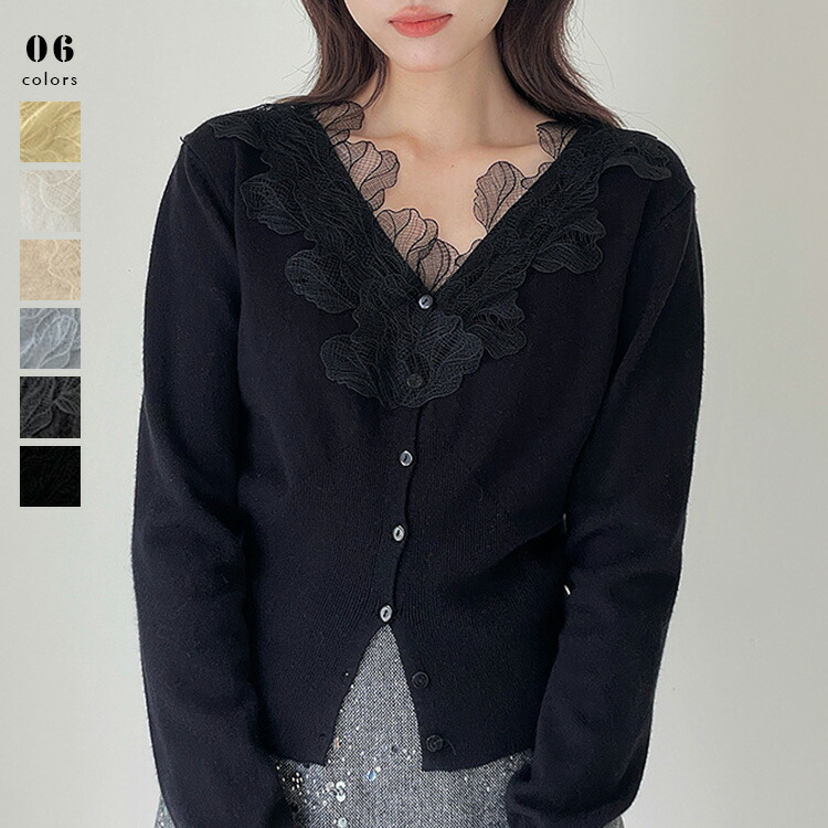 ニット カーディガン 襟レース レディース 秋冬 春 ニットカーディガン セーター トップス 羽織 アウター 羽織り ニットカーデ ニットトップス レーストップス Vネック 華やか 上品 ドッキング