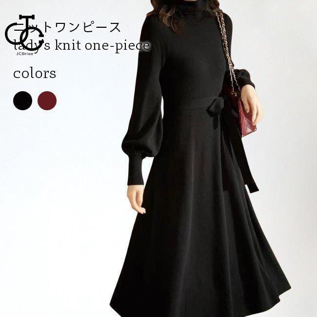 ニット ワンピース レディース ロング丈 ニットワンピ ハイネック 細身 レトロ チュニック バルーンスリーブ 着痩せ 冬ワンピース タートル
