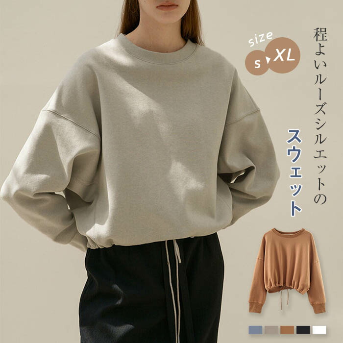 裾ドロスト スウェット レディース 綿 トレーナー レディース ゆる クルーネック 長袖 春 秋 冬 ドローコード レトロ きれいめ プルオーバー ゆったり スポーティ 上品 柔らかい