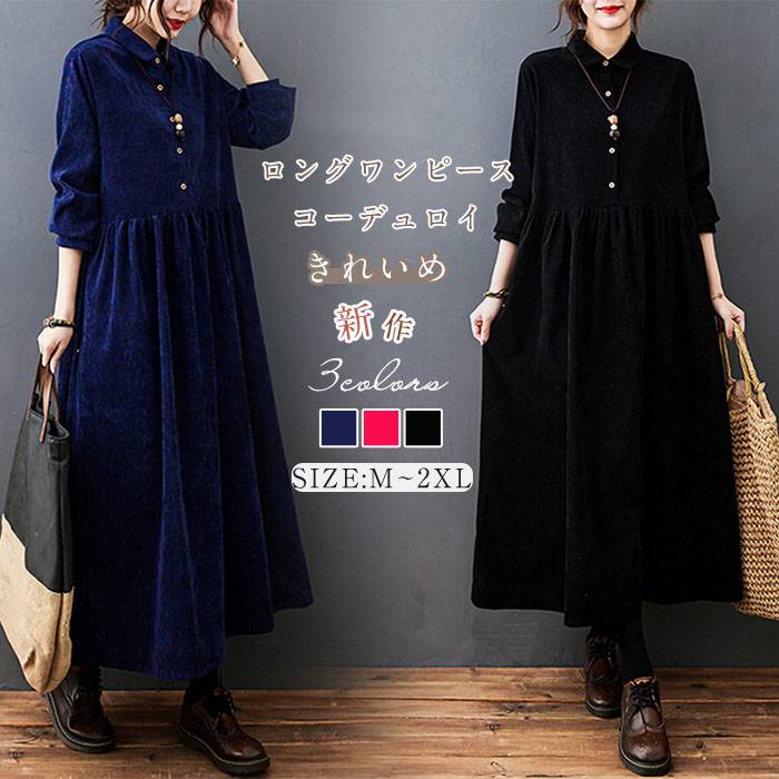 コーデュロイ ワンピース 春 秋冬 きれいめ ロング丈 スタンダードカラー ロングワンピース 50代 秋 長袖 レディース 春秋 切り替え aライン ゆったり 無地 暖かい あったか 体 大きいサイズ
