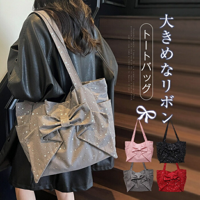 トートバッグ リボン付き レディース 肩掛けバッグ 大きめ ショルダーバッグ 大容量 軽いバッグ 軽量 通学バッグ 通勤 キャンバスバッグ グレー レッド ピンク 大人可愛い ブラック