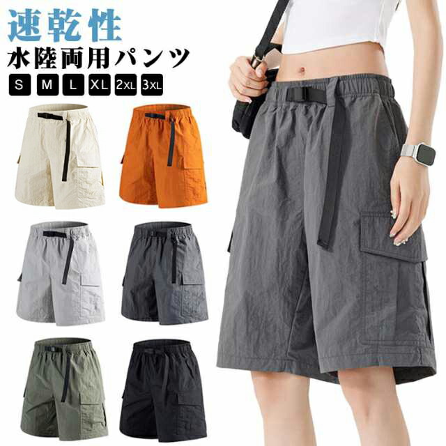 涼しい 水陸両用パンツ ショートパンツ 半ズボン ひざ丈 膝下 カーゴ パンツ ズボン ポケット かわいい アウトドア ゴルフ 無地 夏用 きれいめ