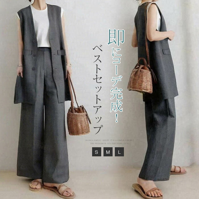 セットアップ ジレ ベスト レディース ベストスーツ パンツスーツ 2点セット 上下セットアップ カジュアル ワイドパンツ 春 秋 夏 レイヤード風 着痩せ シンプル カジ 重ね着