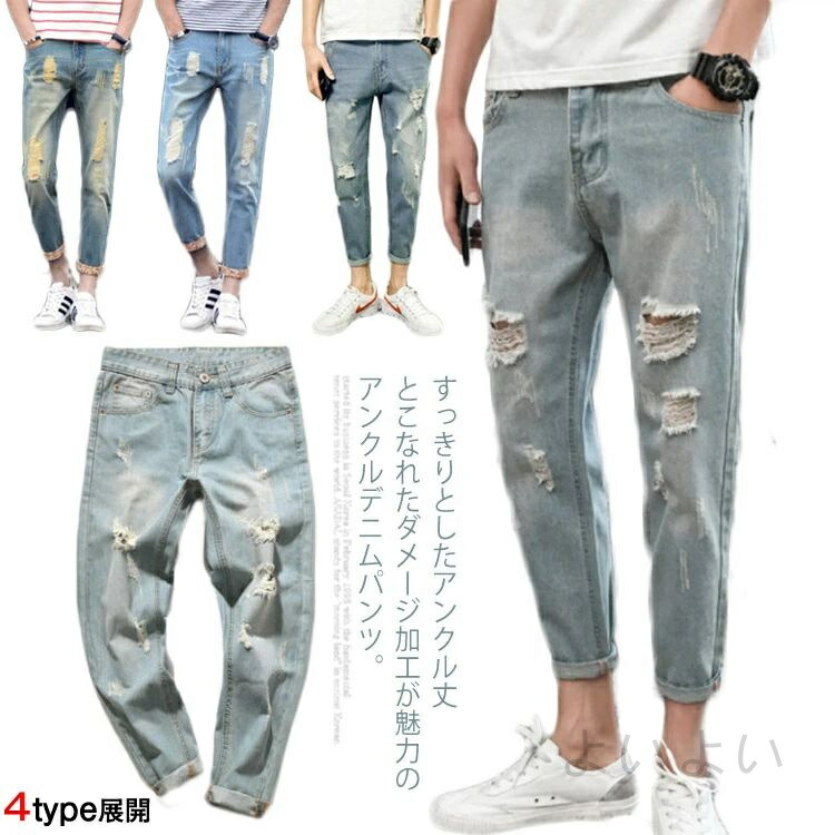 ダメージジーンズ ダメージデニムパンツ メンズ ダメージ加工 デニムパンツ テーパード ズボン ボトムス 9分丈 春夏 ジーンズ