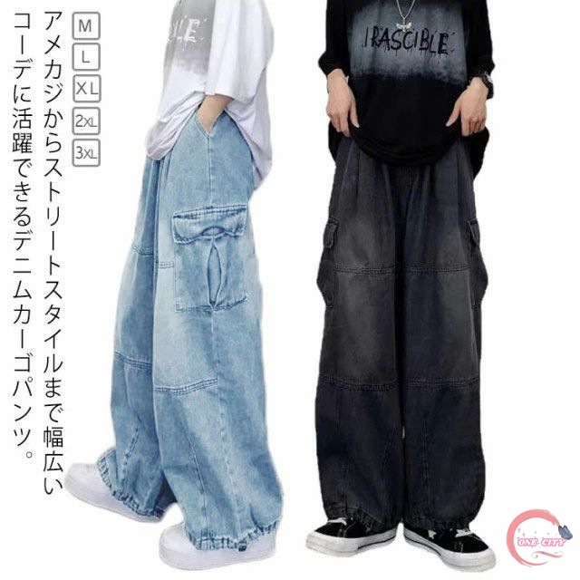 デニム カーゴパンツ メンズ ゆったり ワイド デニムパンツ ビッグ ジーンズ ジーパン 大きいサイズ イージーパンツ ワークパンツ ロングパンツ ストリート アメカジ おしゃれ カジュアル ダ B系