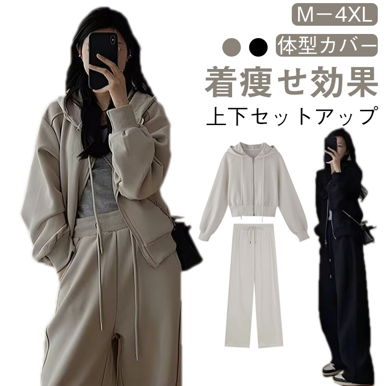 スウェット セットアップ レディース フード付き 長袖 パーカー ワイドパンツ 2点セット 綿 ジャージ 上下セット 春 秋 冬 カジュアル ロングパンツ 部屋着 ルームウェア 韓国ファッショ 着痩せ