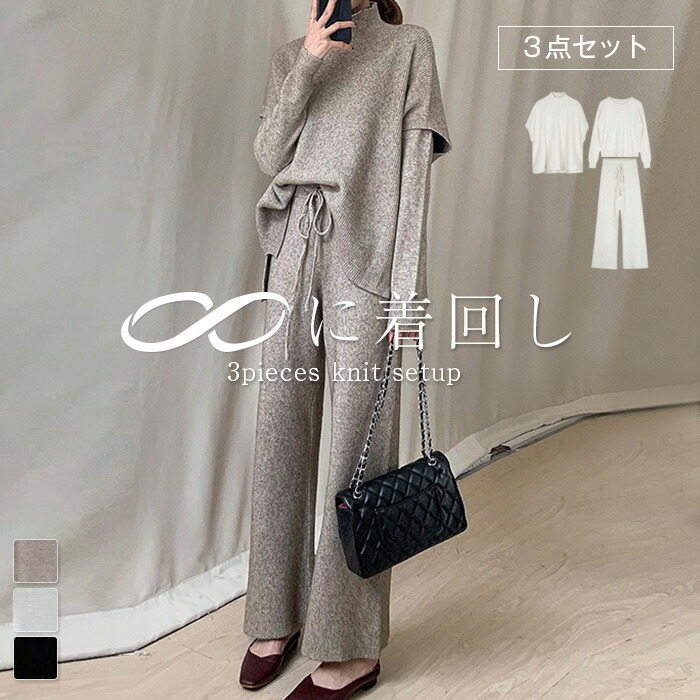 ニット セットアップ レディース パンツ 上品 きれいめ 秋冬 3点セット ニット コーデ セーター ニットアップ タートルネック ワイドパンツ グレージュ ブラック オフホワイト
