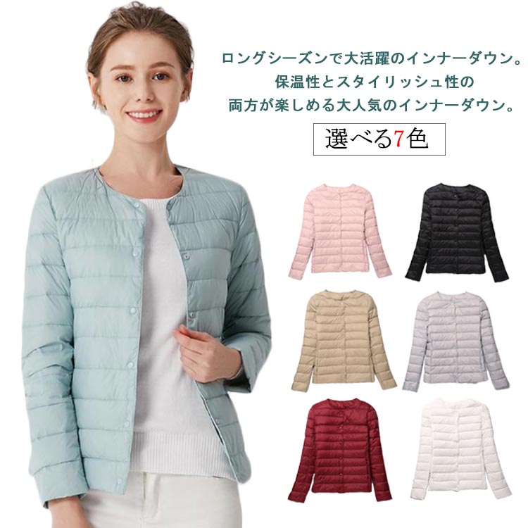 インナーダウン ライトダウン レディース ノーカラー 長袖 大きいサイズ ダウンジャケット ショート コンパクト 無地 シンプル 秋冬 アウター ダウンコート 2way ラウンド 軽い