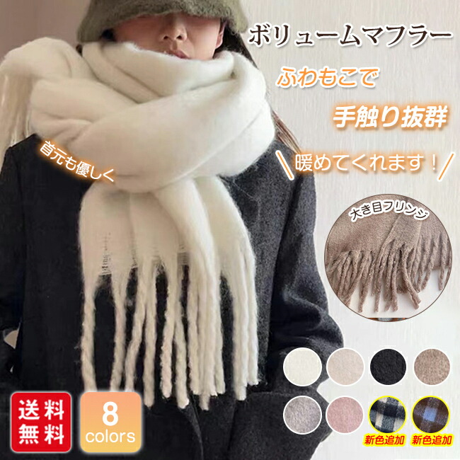 マフラー レディース ストール ショール ふわふわ 起毛 ボリューム 230*35cm 大判 全8色 チェック柄追加 無地 ロング丈 秋冬 太フリンジ