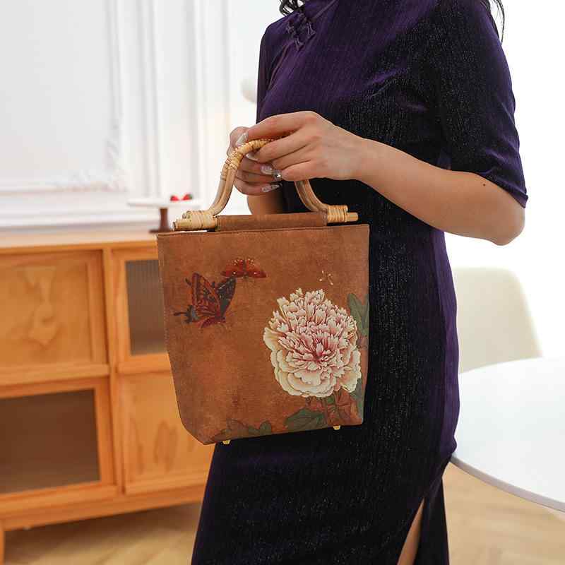 ハンドバッグ レディース 中華風 和柄 レトロ パーティー クラッチバッグ 藤編みハンドル ミニ スクエアバッグ プリント 総柄 上品 普段使い お出かけ ソフトタイプ ポリエステル ファ フォーマル