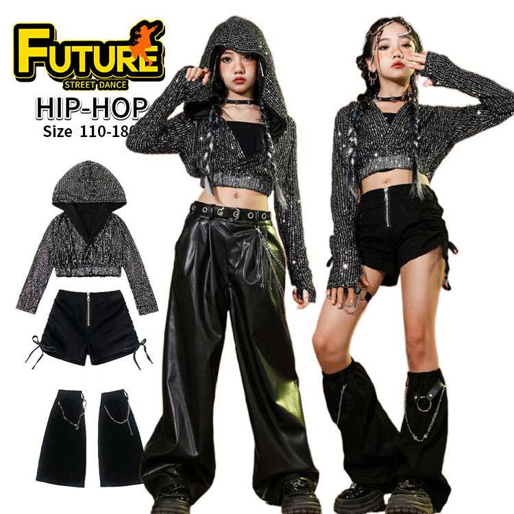 ダンス 衣装 キラキラ キッズ へそ出し トップス 女の子 セットアップ レザーパンツ 短パンツ ワイドパンツ ジャズダンス 韓国 k-pop衣装 ヒップホップ 黒トップス 長袖 か キッズダンス衣装