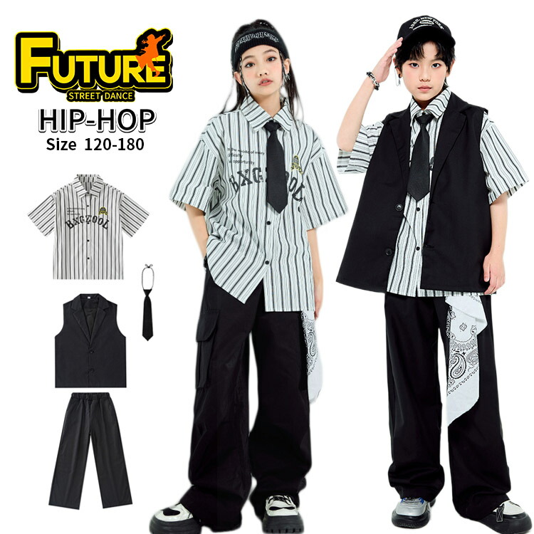 ベスト 黒 キッズ ダンス 衣装 セットアップ 女の子 カーゴパンツ 縦縞シャツ ガールズ 男の子 ヒップホップ 袖なし 韓国 -衣装 アイドル ジャズダンス イベント 120 180
