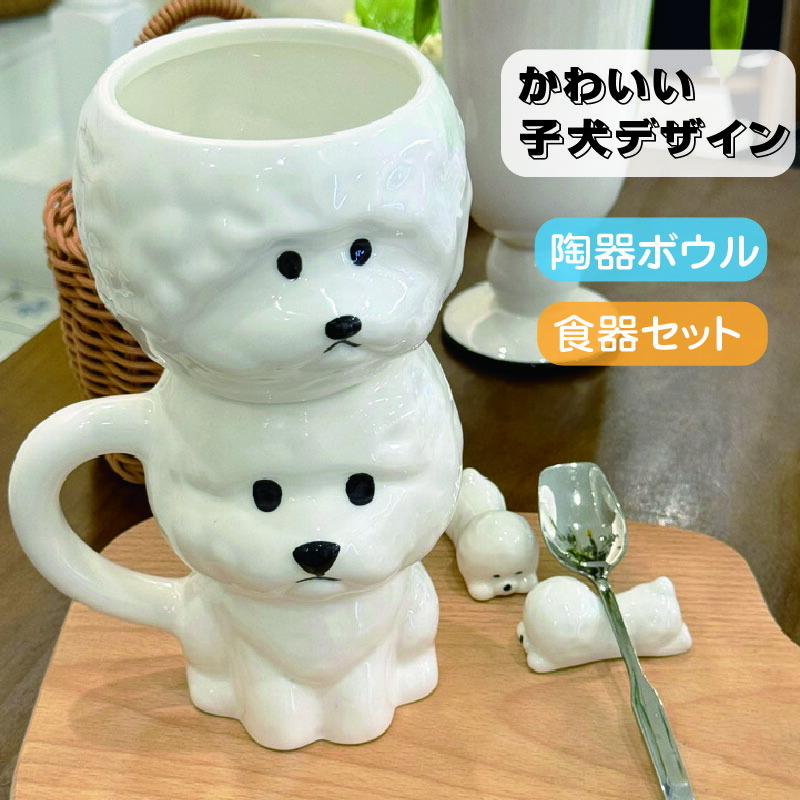 可愛いビションフリーゼデザイン!日常使いにぴったりな陶器セットで、食事の時間をもっと楽しく!