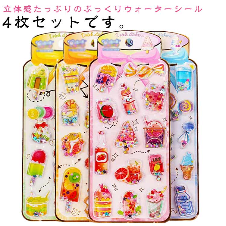 ウォーターシール 4枚セット ご褒美シール 立体シール 可愛い ぷっくりシール ぷくぷくシール 3D立体 シール帳 シール 女の子 小学生 カラフル フルーツ 手帳用 誕生日 クリ ノート