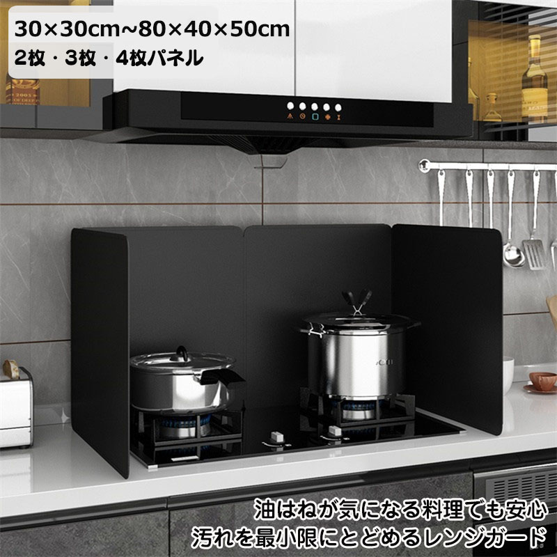 水拭きだけで油汚れが落ちるから繰り返し使えるレンジガード 2面 3面 4面パネルで鍋に合わせてレイアウトが変えられるレンジガード 3タイプ