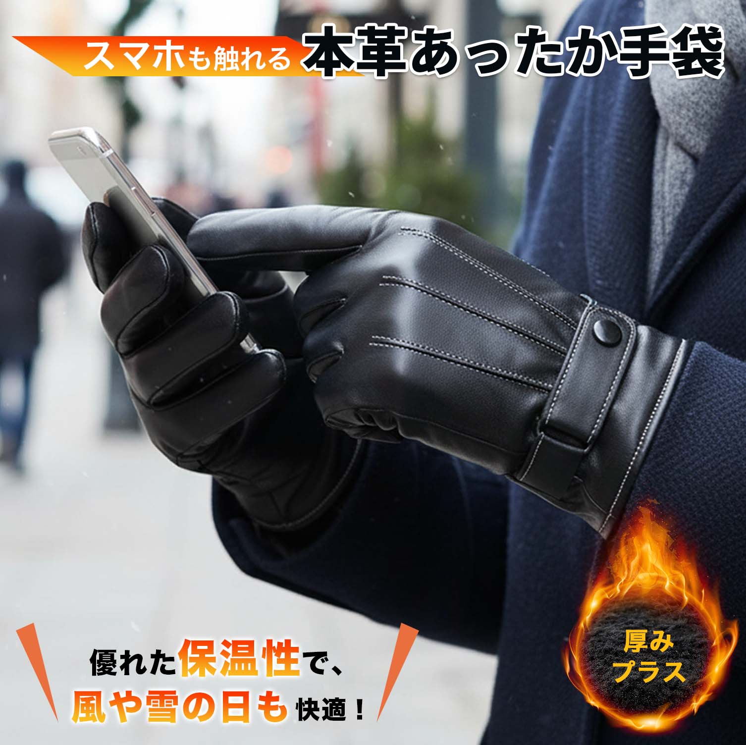 冬の必需品。防寒・防風レザーグローブ。裏フリースで暖かく、スマホもそのまま操作できる快適設計。自転車やバイク通勤にもぴったりの万能モデル。