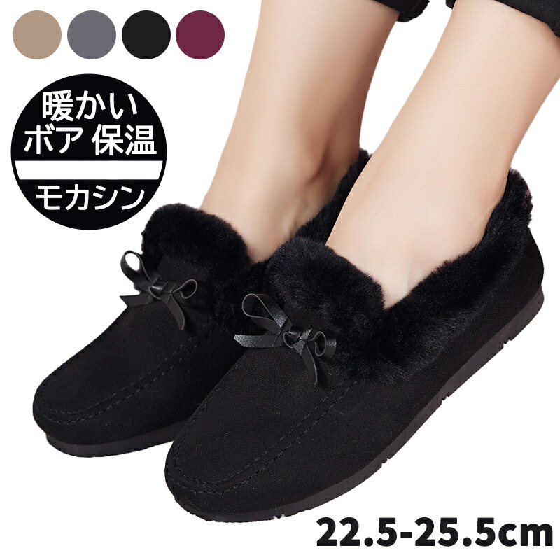 モカシン レディース シューズ スリッポン 軽量 ローヒール ボア 歩きやすい 防寒 ムートン ぺたんこ フラット あったか 黒 ブラック 冬 もこもこ 内ボア フラットシューズ パンプス スエ 秋冬
