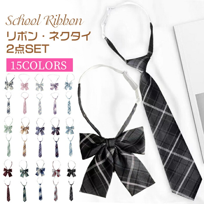 リボン 学生服 スクール JK制服 ネクタイ 2点セット リボンタイ 男女兼用 卒服 女子高生 通学 クイックネクタイ スクールリボン チェック柄 蝶ネクタイ 制服リボン 男子 女子 蝶結び
