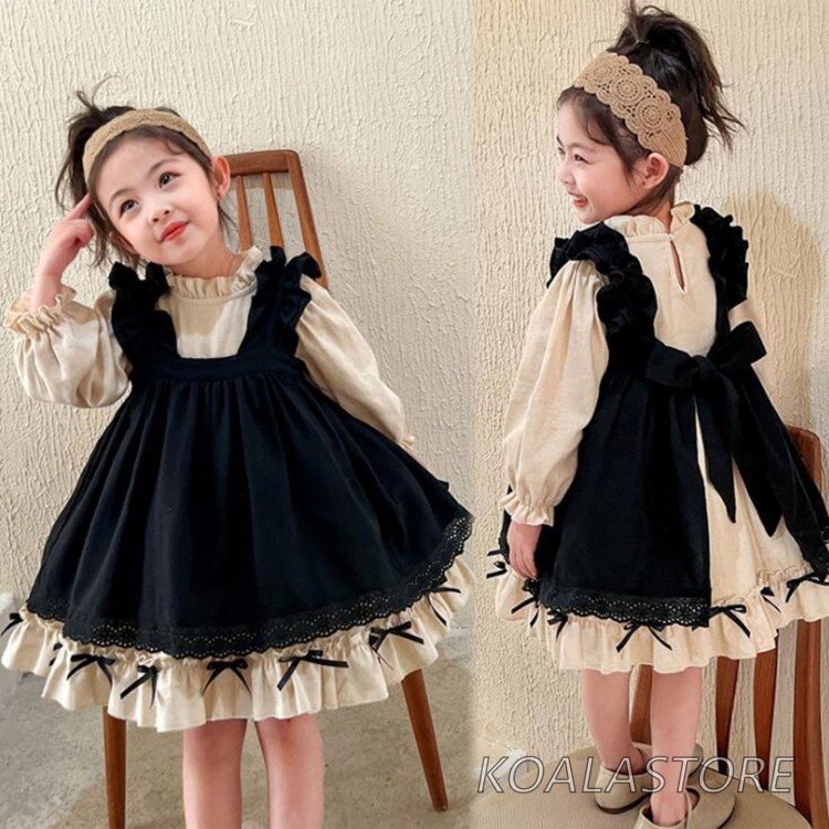 子どもワンピース長袖 子供ロリータ服 ロリータワンピース2点セット エプロンレースフリルリボン かわいいキッズワンピース 森系女の子 お嬢様プリンセスワンピース