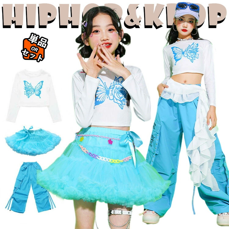 k-pop 衣装 青 水色 キッズダンス衣装 セットアップ ヒップホップ へそ出し トップス 女の子 長袖 カゴーパンツ 青パンツ スカート 蝶柄