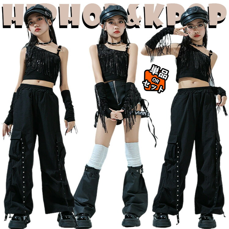 韓国 jazz ブラック トップス パンツ キラキラ 腕カバー キッズ ダンス衣装 セットアップ 上下セット おしゃれ 女の子 かわいい かっこいい カーゴパンツ ダンスウエア ヒップホップ へそ出し