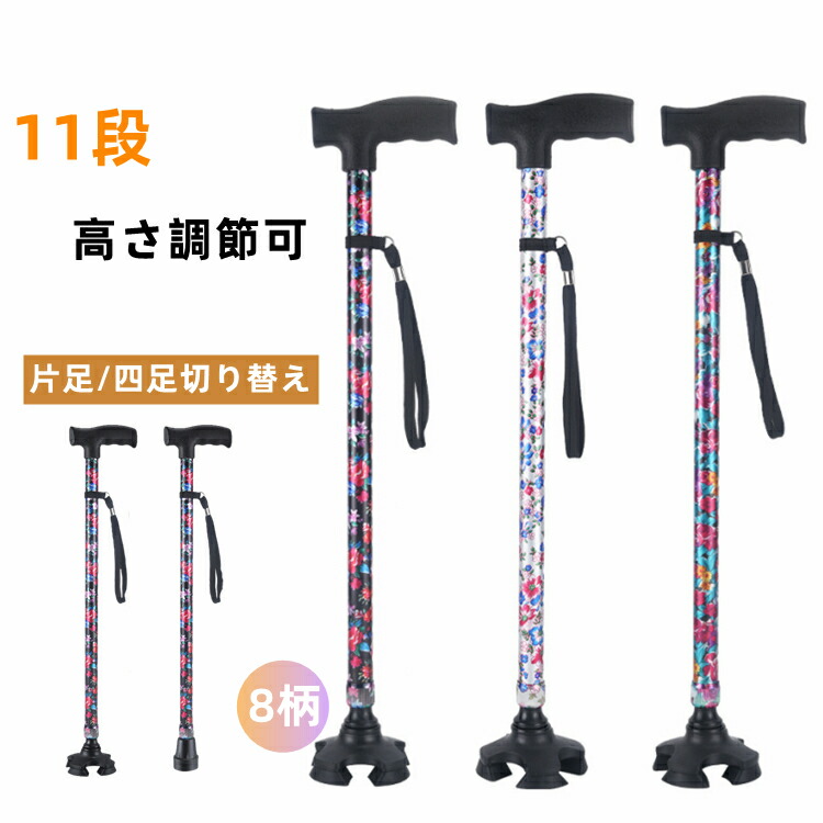 杖 おしゃれ 自立式 四点杖 自立杖 つえ花柄 自立 軽量 伸縮 歩行補助 レディース 女性用 敬老の日 母の日 誕生日 プレゼント ギフト ステッキ 長さ調節 柄杖伸縮型 滑り止め コンパク スリム