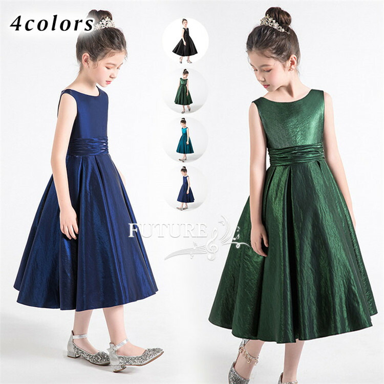 子供ドレス 演奏会 ドレス 黒 4色 ピアノ発表会 中学生 140 150 子ども ジュニア 女の子 子供 キッズドレス ミドル丈 ワンピース 袖なし 小学生 結婚式 卒 青緑