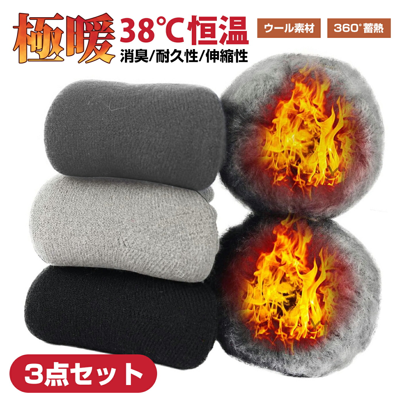 【 3足セット】靴下 メンズ 冬 厚手 ウールソックス 防寒 暖かい【極暖38℃恒温・極厚裏パイル・360°蓄熱】【履いた瞬間から速暖・抗寒力】保温 抗菌消臭 24.0~28.0