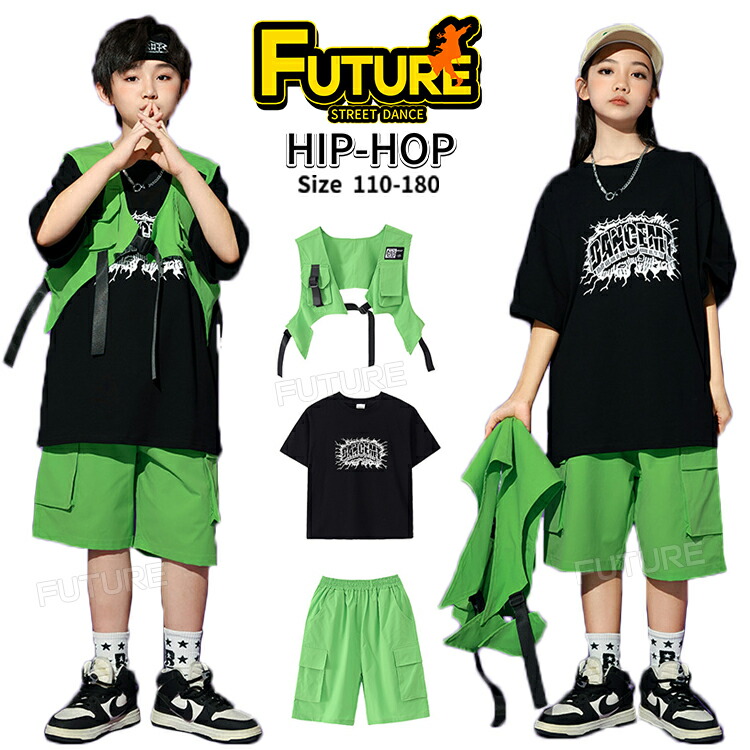 ベスト 緑 ダンス 衣装 ヒップホップ キッズダンス衣装 tシャツ 黒 トップス パンツ セットアップ グリーン 男の子 女の子 半ズボン ワイドパンツ キッズ 韓国 KPOP ステ k-pop