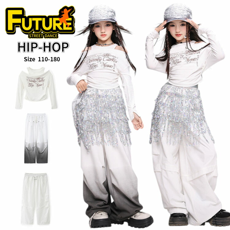 白 キッズ ダンス 衣装 セットアップ へそ出し 長袖 シャツ パンツ k-pop 腰飾り ホワイト ヒップホップ チアダンス アイドル 女の子 トップス 演出 ジャズダンス 社交ダ 子供