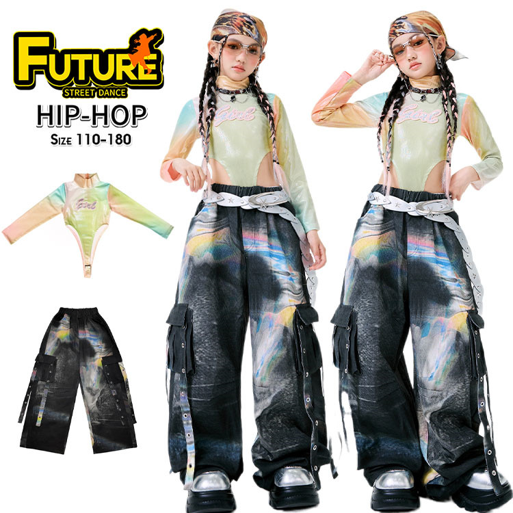 k-pop 衣装 キッズダンス衣装 セットアップ ヒップホップ トップス 女の子 長袖 カラフル デニムパンツ カーゴパンツ タイダイ染 チアガール 韓国 HIPHOP 応援 チアダンス
